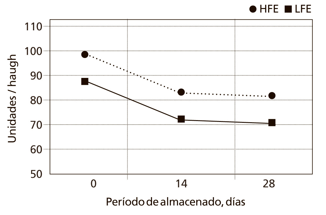Como puede verse, los huevos de las gallinas del grupo HFE tuvieron un mayor peso de su albumen y una mejor calidad interna –expresada en Unidades Haugh – que los de las del grupo LFE, tanto en estado fresco como durante un almacenamiento hasta de 28 días. En cambio, el peso de la yema de los huevos del grupo LFE fue más alto que el de los del grupo HFE.