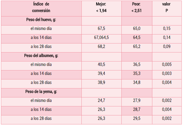 Tabla 1. Influencia del índice de conversión de las gallinas sobre algunas características de sus huevos.